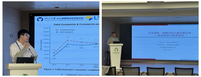 东京大学博士生应文杰分享了一项关于保险销售环节事前道德风险的研究,通过一个列表实验分析发现职业伦理培训能有效抑制销售人员与参保人的合谋退保行为。浙江大学硕士生王舒怡分析了我国知识产权保险市场现状,指出应通过完善市场运作和健全监管来促进市场长效发展。华南农业大学硕士生邓柏禹的报告指出政策性农业保险促进了农业高质量发展,当前效果主要体现在东、西部地区。河南财政金融学院岁磊副教授的理论研究表明,低稳定性岗位雇员更易发生道德风险行为,其保职努力程度也较低。