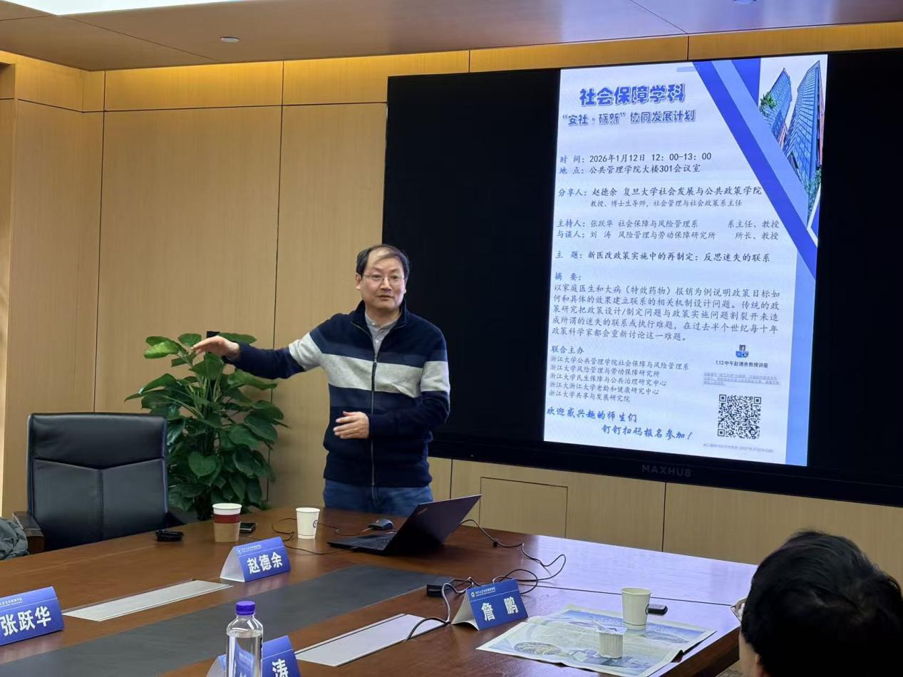 2026年1月12日,浙江大学公共管理学院社会保障与风险管理系"安社·砺新"协同发展计划系列讲座在学院大楼301会议室顺利举行。本次讲座特邀复旦大学赵德余教授,主题为《新医改政策实施中的再制定:反思迷失的联系》。浙江大学公共管理学院社会保障与风险管理系系主任张跃华教授主持,风险管理与劳动保障研究所所长刘涛教授担任评议嘉宾。公共管理学院张翔教授、杨一心副教授、詹鹏特聘研究员、谢勇老师、赵婷老师和20余位师生共同参与。赵德余教授以其二十多年的持续研究为主线,以生动的实践案例阐述了政策制定与实施之间“迷失的联系”与反思。